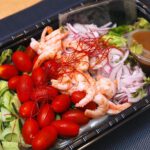 僕はスライスオニオンが大好きで、妻はスライスオニオンが苦手。つまり、我が家ではプリプリエビとプチプチトマトとシャキシャキスライスオニオンの素敵なハーモニーを堪能できたのは僕だけ。この組み合わせ、実に最高である。