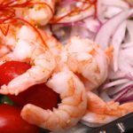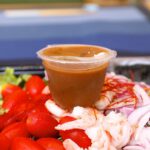 ぷりっぷりのエビとプチップチのトマト、シャキッシャキのスライスオニオンをトッピングしたキュウリとレタスのサラダのチョレギドレッシングを添えたもの、それがコストコの「チョレギサラダ」である。