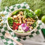 ロメインレタスとケール、グリルドチキン、ルッコラ、ローストトマト、ホワイトチーズ、レッドオニオン、ウォルナッツ、シラントロ(パクチー)ライムビネグレット