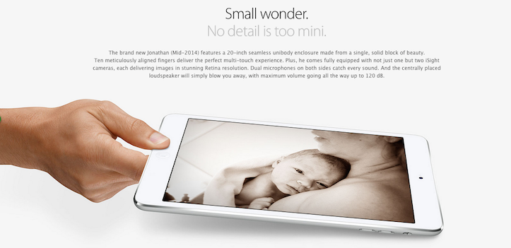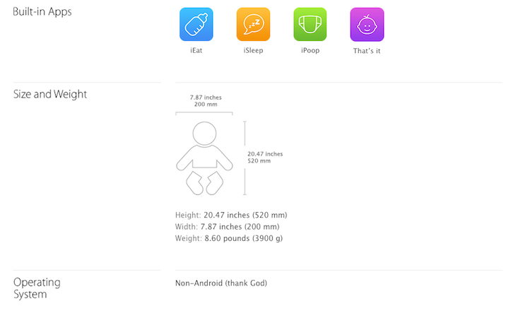 ゴリミーブログ 話題のネタ 可愛い画像 本気でAppleが好きなら、自分の子どもが生まれた時にはこうやって報告するべきだ g.O.R.i 2014年08月27日 本気でAppleが好きなら、自分の子どもが生まれた時にはこうやって報告するべきだ 【img via The Next Web】 Andreas Kleinkeさんは元Apple社員。めでたいことにJonathan Henry君という男の子が生まれた。 自分の子どもが生まれたら自分の家族はもちろんのこと、身近な友達や職場の同僚などにいち早く伝えたいはず。そこで、KleinkeさんはJonathan Henry君の写真を撮って画像を作ったのだが、仕上がった作品があまりにもApple愛に溢れているとYahoo Techに取り上げられて話題になっている。 上記の画像に何か見覚えはないだろうか。実は、AppleのiPad miniの商品ページと再現しているのだ!クオリティが高すぎる! 【img via Apple - iPad mini Retinaディスプレイモデル】 子どもへの愛もAppleへの愛も溢れてる!すごい! 上記の画像だけでも素晴らしいが、仕様ページを模倣した画像がとにかくユーモラスで見ていて思わずニヤけてしまう。 Jonathan Henry君の高さ(身長)は520mm、重さ(体重)は3900g。予め”インストール”されているアプリは「iEat(食べる)」「iSleep(寝る)」「iPoop(おトイレ)」「That it(そう、それ!)」の4つ。アイコンまで作られていて可愛らしい。 【img via The Next Web】 最も注目すべきところは「Operating System」。「Non-Android(Androidではない)」とあえて書いているところが元Apple社員らしくて良い。 商品説明に書かれている英語もiPad miniの商品説明と変わらない素敵な表現が使われている。「And the centrally placed loudspeaker will simply blow you away, with maximum volume going all the way up to 120dB(中央に配置された最大120dBの出力を可能とするスピーカーには驚かされるだろう。)」というのが個人的に一番ニヤけてしまった。 【img via The Next Web】 ちなみに対応キャリアは「Mom and Dad(お父さんとお母さん)」であるとのこと。秀逸すぎる! もし、あなたが大のAppleファンを自称するのであれば、自分に子どもができた時にAndreas Kleinkeさんのように発表してみてはいかがだろうか! (via The Next Web)