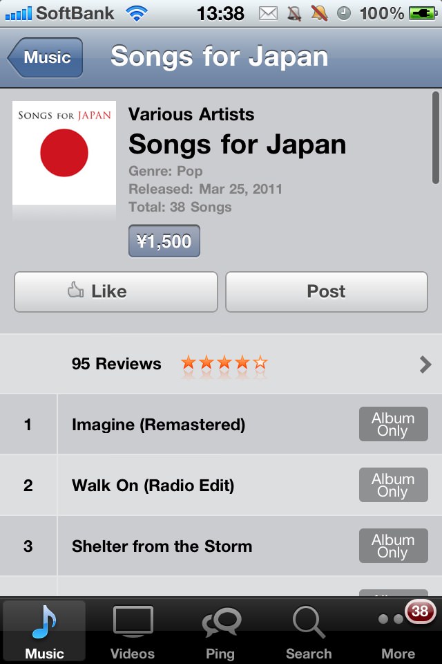 ゴリミーブログ ミュージック iTunes Storeでチャリティーアルバム「Songs for Japan」販売、全額日本赤十字へ寄付 g.O.R.i 2011年03月26日 iTunes Storeでチャリティーアルバム「Songs for Japan」販売、全額日本赤十字へ寄付 iTunes StoreでLady GagaやKaty Perryなどトップアーティストによるチャリティーアルバム「Songs for Japan」を1500円で販売開始した。 3月11日に発生した東日本大災害による被害からの復興を、世界中のトップアーティストがチャリティーアルバムで支援。アルバム(全38曲)にはLady Gaga "Born This Way" 限定リミックス、Katy Perry "Firework"、BrunoMars "Talking to the Moon"、Adele "Make You Feel My Love"を含む、多数のビッグヒットナンバーを収録。Apple、レーベル各社、アーティストが受け取る収益金は全て日本赤十字社へ寄付されます。 ▽全38曲のアーティストは以下の通り。 「Imagine (Remastered)」ジョン・レノン 「Walk On (Radio Edit)」U2 「Shelter from the Storm」ボブ ディラン 「Around the World (Live)」Red Hot Chili Peppers 「Born This Way (Starsmith Remix)」Lady GaGa 「Irreplaceable」Beyoncé 「Talking to the Moon (Acoustic Piano Version)」Bruno Mars 「Firework」Katy Perry 「Only Girl (In the World)」Rihanna 「Like I Love You」ジャスティン・ティンバーレイク 「Miles Away (Live)」Madonna 「When Love Takes Over (feat. Kelly Rowland)」デヴィッド・ゲッタ 「Love the Way You Lie (feat. Rihanna) [Clean Version]」Rihanna & Eminem 「Human Touch」Bruce Springsteen 「Awake (Live)」Josh Groban 「Better Life」キース・アーバン 「One Tribe」The Black Eyed Peas 「Sober」P!nk 「It's OK」Cee Lo Green 「I Run to You」Lady Antebellum 「What Do You Got?」Bon Jovi 「My Hero」Foo Fighters 「Man On the Moon (Live)」R.E.M. 「Save Me (Clean Version)」ニッキー・ミナージュ 「By Your Side」Sade 「Hold On (Radio Edit)」マイケル・ブーブレ 「Pray (Acoustic)」ジャスティン・ビーバー 「Make You Feel My Love」ADELE 「If I Could Be Where You Are」Enya 「Don't Let the Sun Go Down On Me」エルトン・ジョン 「Waiting On the World to Change」ジョン・メイヤー 「Teo Torriatte (Let Us Cling Together) [Remastered]」Queen 「Use Somebody」Kings of Leon 「Fragile (Live In Berlin)」The Royal Philharmonic Concert Orchestra, Steven Mercurio & Sting 「Better In Time」Leona Lewis 「One In a Million」Ne-Yo 「Whenever, Wherever」Shakira 「Sunrise」Norah Jones ▽僕も早速ダウンロードしてみた。ShakiraとかEminemとか聴くの久しぶりだ。