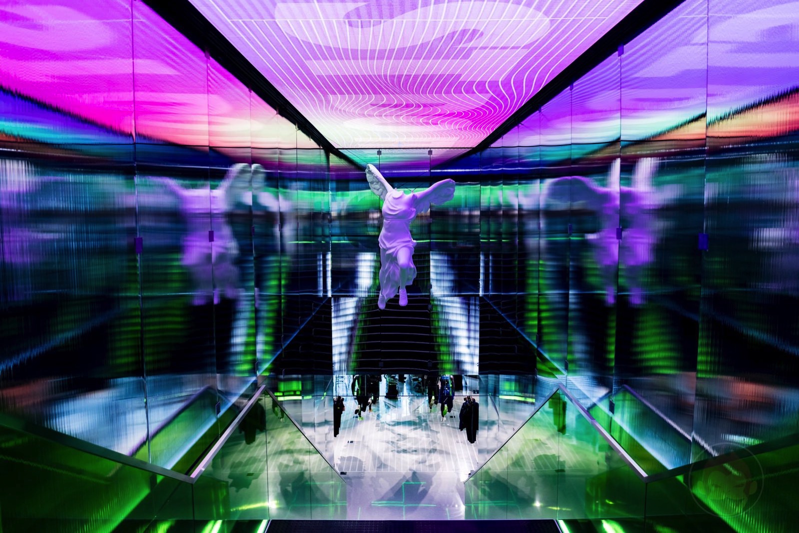 メンズフロアに上がるためには、中央にある階段を登る。上の空間にはナイキのロゴのモチーフとなった、ナイキのシューズを履いた女神ニケが飾られている。