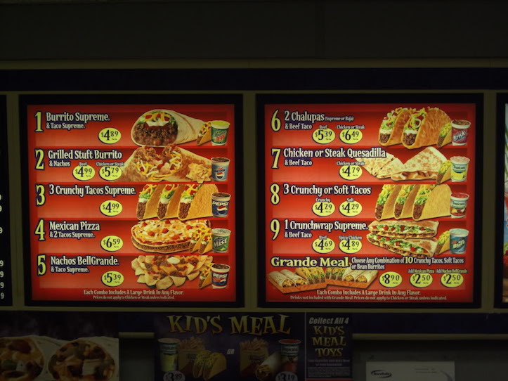 これが海外のTaco Bellのメニュー。巨大なブリートとタコスがドリンク付きのセットで4.89ドル。