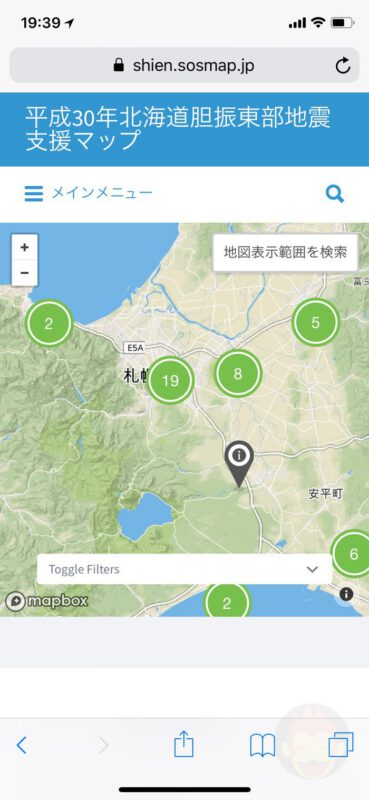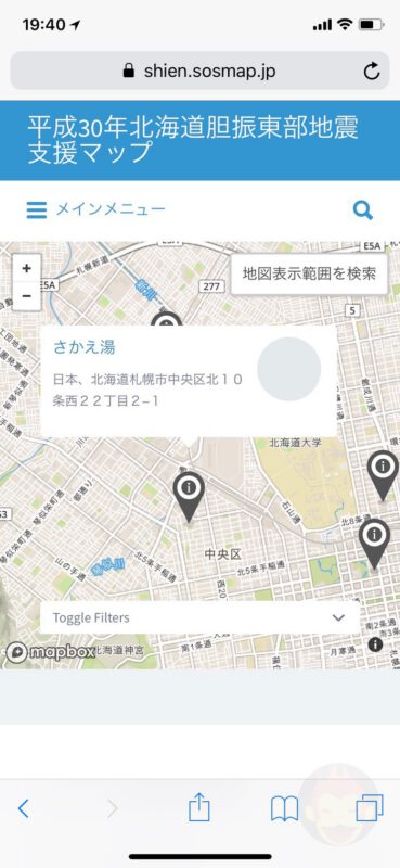 ゴリミーブログ ニュース・時事ネタ 天気・災害情報 【北海道地震】給水所、充電施設、トイレ、銭湯が探せる「支援マップ」が公開 g.O.R.i 2018年09月07日 【北海道地震】給水所、充電施設、トイレ、銭湯が探せる「支援マップ」が公開 北海道全域で利用できる給水所、充電施設、トイレ、銭湯を探すことができる「北海道地震支援マップ」が公開されている。 開発運営者はt.misawaさん。携帯各社は無料充電スポットの提供を実施しているが、それだけではなく給水所や銭湯、さらにはトイレの情報まで探すことができ、現地で役に立ちそうなウェブサービスとなっている。 これは現地の方々がお互い力を合わせて情報を共有できるサービス。「トイレお貸しします・休憩できます」とか「会社を臨時避難所に解放しています!」などの情報を投稿できる「情報登録」ページも用意されている。詳しい使い方はこちらのnoteを参考にどうぞ。 さらには地震に関連する最新のSNS投稿を横断して検索することができる「平成30年北海道胆振東部地震SNS横断検索」も提供。最低50リツイートされているツイートのみを表示対象としているとのこと。現地の皆さんのお役に立てば幸い。 平成30年北海道胆振東部地震支援マップ