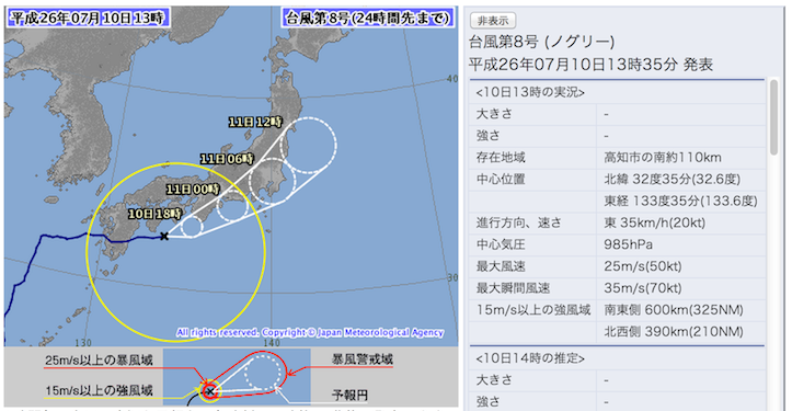 気象庁の発表している台風8号の最新情報も合わせてチェックしておくべし。以下の通り:
