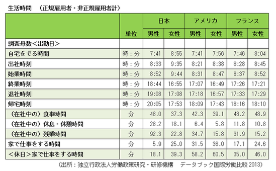 どこを調べてもそれらしいソースが見当たらないため、「独立行政法人労働政策研究・研修機構 データブック国労働比較2013」の表を参考にすると、日本人男性の平均退社時刻は19時08分、女性は17時08分となっていて、平均帰宅時刻は男性が20時05分、女性が17時53分となっている。