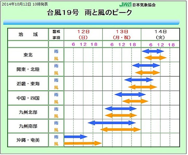 公開されている台風19号の影響による、日本各地の雨と風のピーク。関東は13日(月)の寄る18時以降から雨が強まり、14日(火)午前中いっぱいは風とともにピークであるそうだ。ただでさえ連休明けで会社や学校に行きたくない人にとってはあまりにも辛すぎる仕打ちだ。