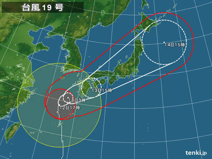 18時49分現在、公開されている台風19号の最新進路予想は以下の通り。明日13日(月)に九州を旅立ち、14日の15時頃までには抜けてしまうようだ。つまり、やはり台風19号は14日の午前中に首都圏を直撃するような動きになると予想されている。