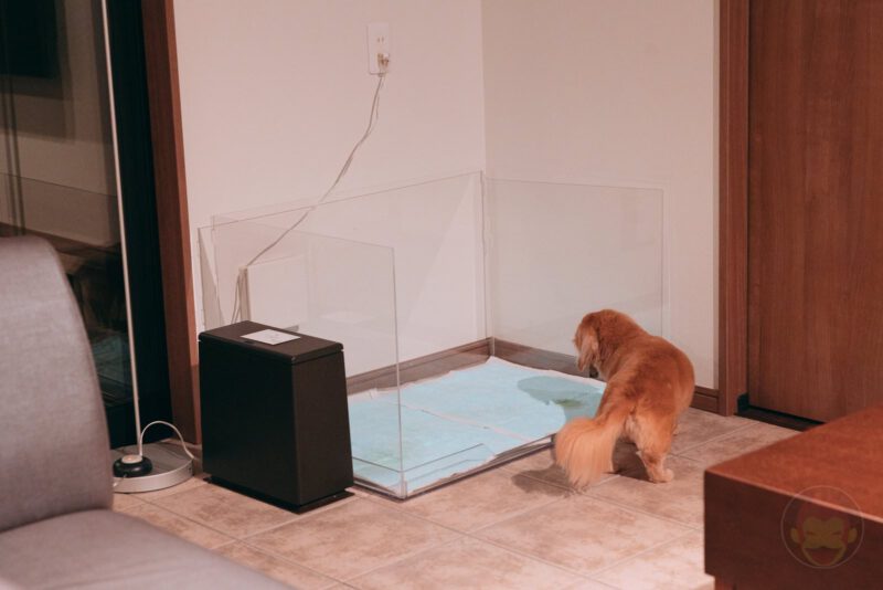 トイレは、シート2枚分の広さでアクリル板で部屋と仕切られている。手前にはゴミ箱があり、汚れたトイレシーツはすぐに捨てられる。